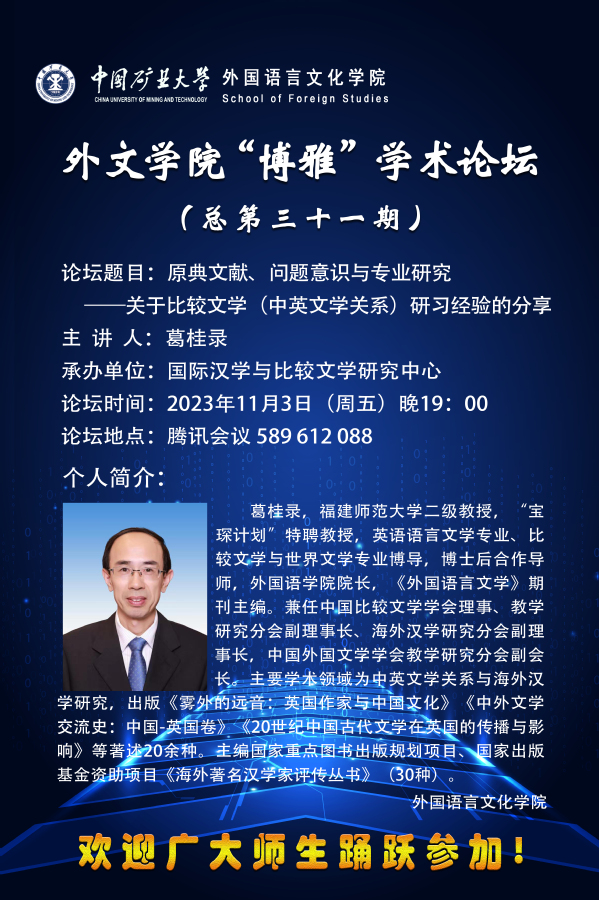 外文学院“博雅”学术论坛(总第三十一期)原典文献、问题意识与专业研究 ——关于比较文学(中英文学关系)研习经验的分享