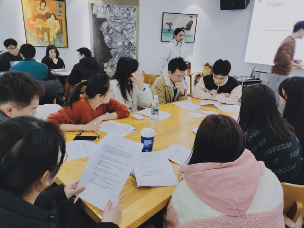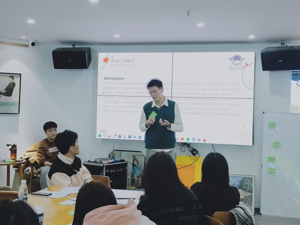 活动开始,主持人以有关单身和结婚现状的视频引入话题,并带领同学们以热身活动 “你画我猜”开启对话题的思考。在接下来的小组讨论环节中,各小组就十个相关话题展开讨论。话题包括Do you prefer staying single or getting married, why? What would your ideal boyfriend or girlfriend look like? 等。这些话题帮助同学们打开了思路,头脑风暴中也看到了彼此之间观点的异同。在讨论过后的辩论环节,各组成员更是各抒己见,场面热烈精彩。最后,各组同学分别上台,通过“撕标签”和即兴演讲的方式表达自己的观点。