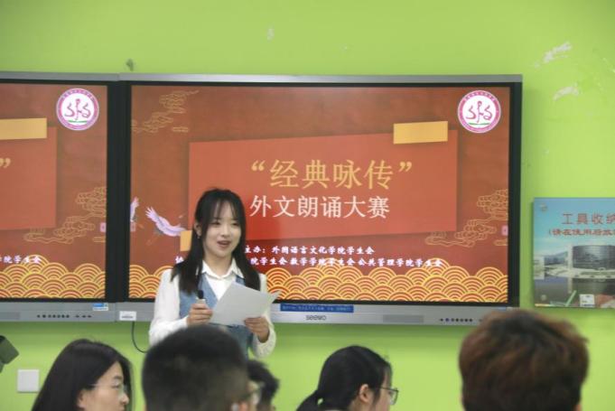 为丰富校园生活,增强外语学习氛围,428日,“经典咏传”外文朗诵大赛在博5A101举行。活动由外文学院学生会主办,经管、数学、公管学院学生会协办,比赛邀请了宫蔷薇、刘会民老师等担任评委。