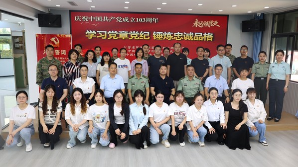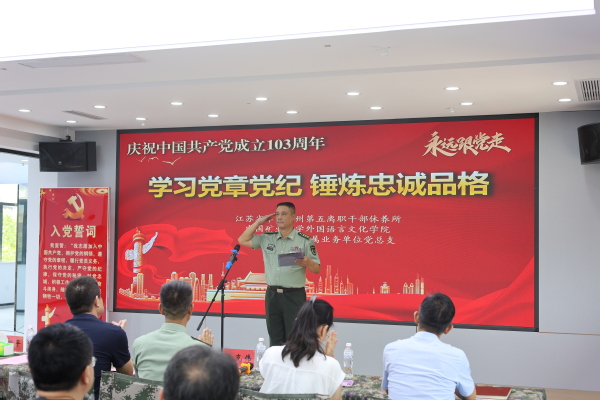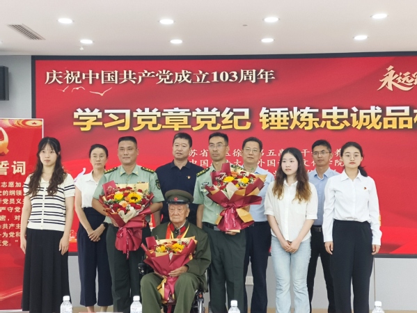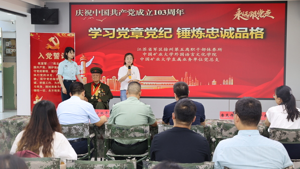 为迎接中国共产党成立103周年,推动党纪学习教育走深走实、入脑入心,6月28日上午,外文学院与校直属业务单位,联合江苏省军区徐州第五离职干部休养所共同举办“学习党章党纪、锤炼忠诚品格”“七一”主题党日活动。参加过抗美援朝战争、荣获朝鲜三级国旗勋章、荣立三等功二次的98岁的离休老干部孙金波,外文学院党委书记张向东、副书记朱正中及部分学生党员代表,校直属业务单位党总支书记方跃平、副书记尹良伟及部分教职工,江苏省军区徐州第五离职干部休养所所长李新胜、政委唐克伟及部分官兵参加活动。唐克伟主持活动。