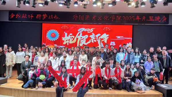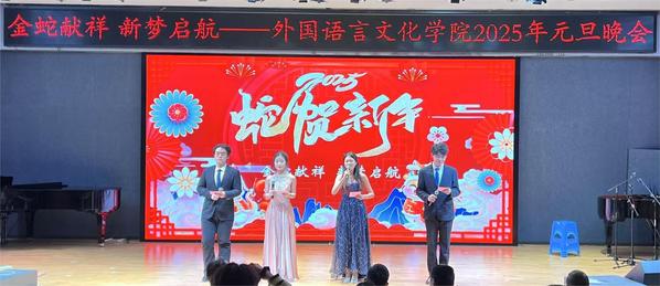 蛇舞添新景,岁换万象新。12月27日晚,外文学院在人文与艺术学院报告厅举办“金蛇献祥 新梦启航”2025年元旦晚会。院领导祖大庆、朱正中、翟石磊与学院师生共同庆祝新年的到来。