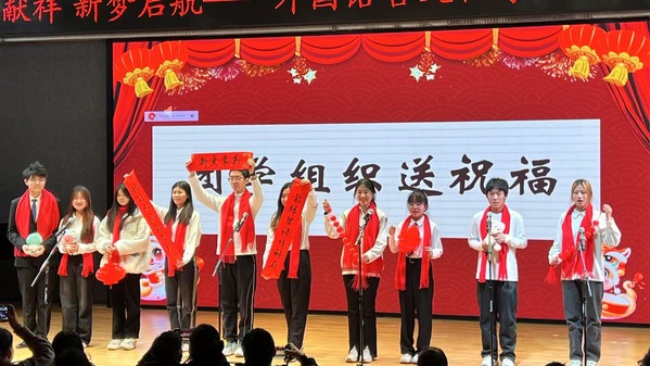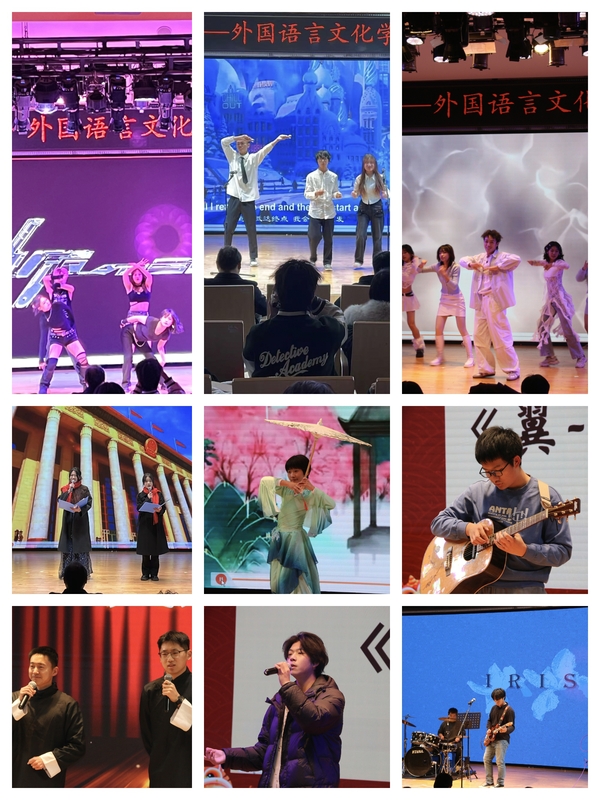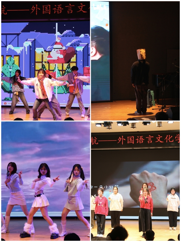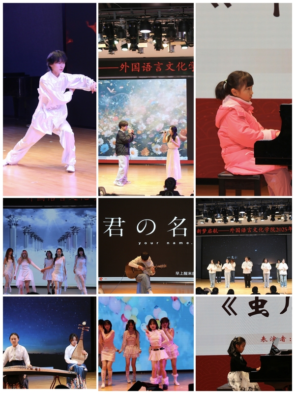 晚会由“华章将启,韵律成诗”“欢歌悦动,新禧同唱”“瑞彩盈年,志启新程”三个主篇章和互动环节、团学组织送祝福环节组成。晚会内容丰富,形式多样,节目涵盖舞蹈、歌曲、诵读、吉他演奏、相声、武术、乐队表演、钢琴演奏、配音、手语操等形式,充分展示了外文学子的才艺与青春活力。子弟们带来的表演充满童趣,活泼可爱,为晚会增添了欢乐。在互动环节,主持人以幽默风趣的风格引导观众参与猜谜语、歌词接龙,现场气氛热烈,同学们积极参与。送祝福环节中,院团委、学生会、研究生会等团学组织负责人依次上台展示由同学们自己制作的贺年卡、春联,并为师生送上新春祝福。