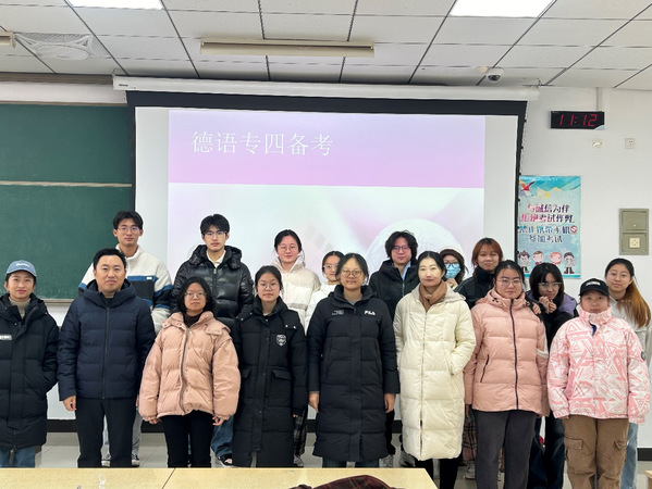 常波从听力听写阅读语法与词汇和写作五个板块进行讲解,针对考试难点进行技巧点拨,分享相关学习方法。匡洁和骆佩就下学期德语的学习课程进行具体安排,建议学生利用寒假时间练习专四考试内容,并结合自身学习经历,鼓励学生积极规划未来发展。