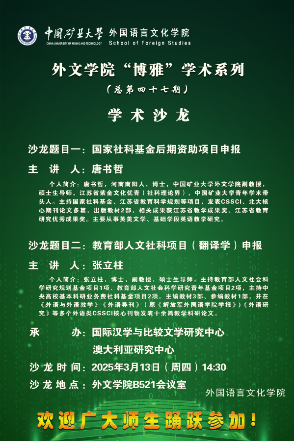 外文学院“博雅”学术系列(学术沙龙)总第47期 --国家社科基金后期资助项目申报、教育部人文社科项目(翻译学)申报