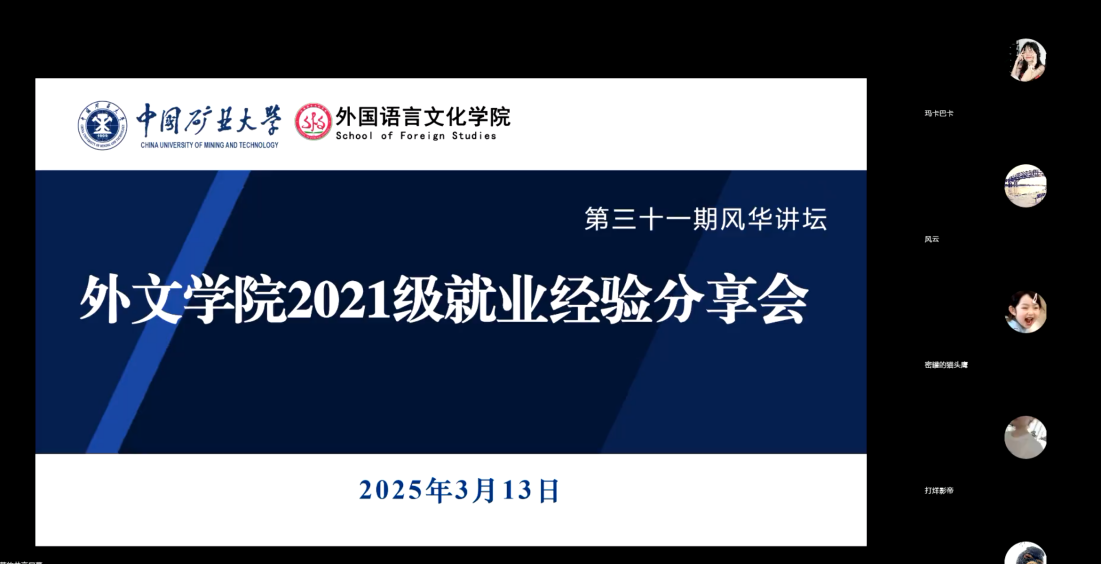 3月13日晚,外文学院举行风华讲坛之线上就业经验分享会。2021级学生王佳星(入职徐州工程机械集团进出口有限公司)、朱家伟(入职合肥方田教育科技有限公司)、冉卓凡(入职中国建设银行)、金学丽(入职北京理想汽车有限公司)、倪晶晶(入职江苏国泰华盛实业有限公司)主讲,辅导员汪萍主持会议,部分拟就业学生参加会议。