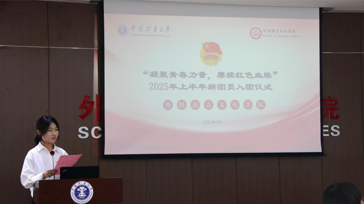5月30日上午,以“凝聚青春力量,赓续红色血脉”为主题的外文学院2025年上半年新团员入团仪式在B508会议室隆重举行。院关工委常务副主任李灏、院党委副书记朱正中、校团委组织与宣教科科长赵云龙、院团委书记闫瑾、学院专兼职辅导员参加仪式。仪式由院团委学生副书记于晓杰同学主持。