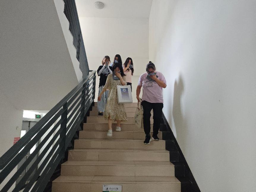 上午11时10分,随着一阵急促的消防警报声在学院楼内响起,演练正式启动。在模拟火灾场景中,工作人员在楼内迅速释放烟雾。师生们用湿毛巾捂住口鼻,弯腰低姿沿疏散指示标志从楼梯通道撤离。整个过程师生响应迅速、组织有序,达到了演练预期的效果。