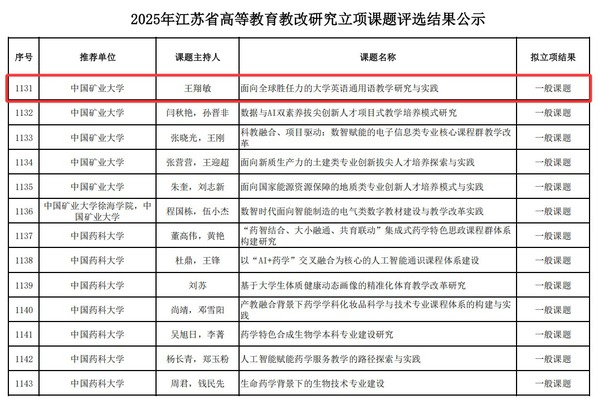 近日,外文学院在江苏省及全国教改课题立项评选中连获佳绩,获批2025年江苏省高等教育教改研究课题一般项目1项,2025年度高等教育科学研究规划课题重点项目1项、一般项目1项。