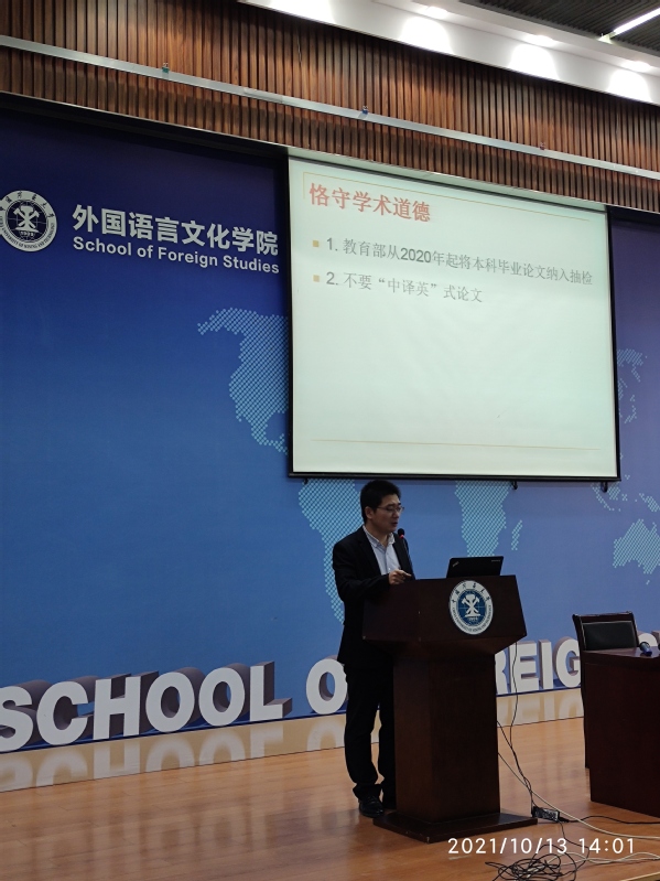 10月13日下午2点,外文学院英文系在文科楼B102报告厅举行“2022届本科毕业论文动员会”。出席本次会议的老师有外文学院副院长刘婷婷、英文系主任唐书哲,会议由翟柯宇老师主持,外文学院英文系2018级学生到场参加。