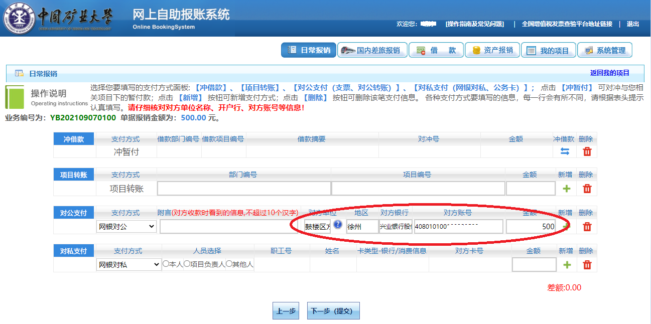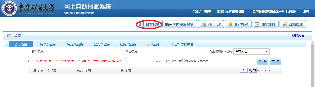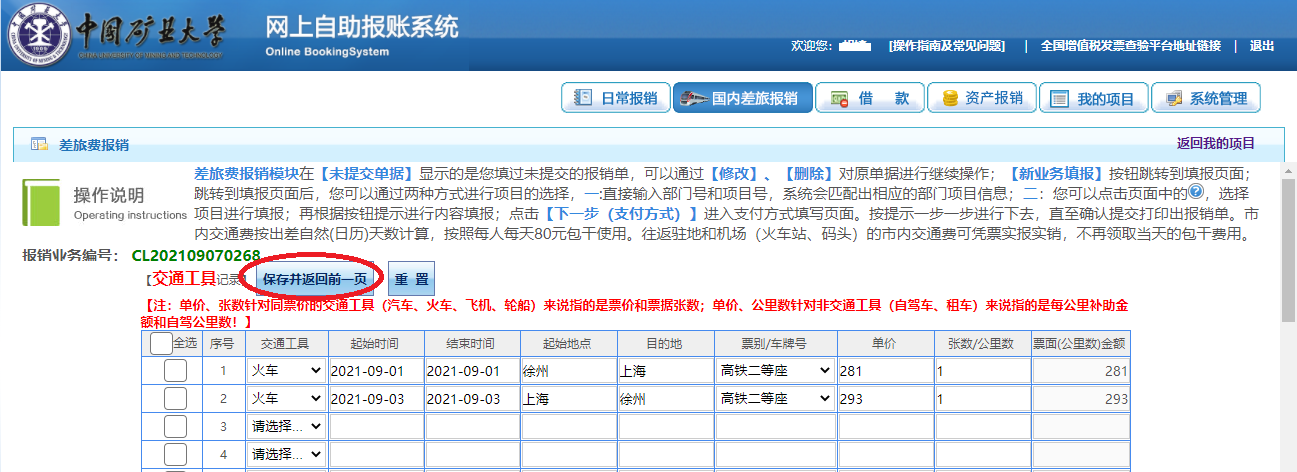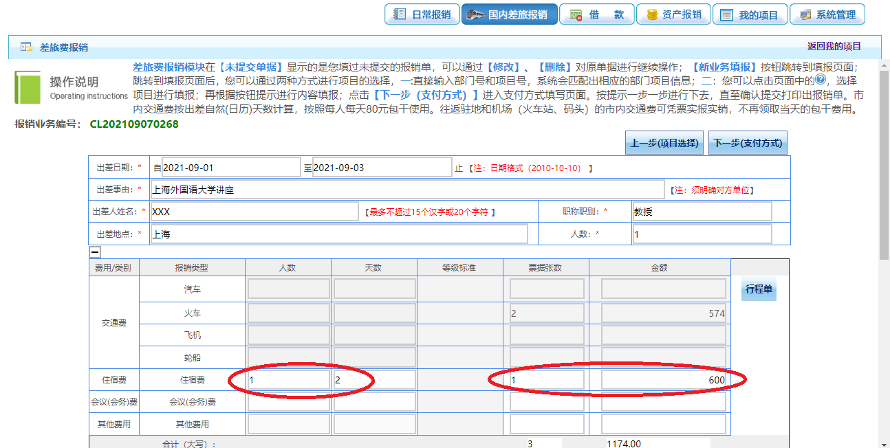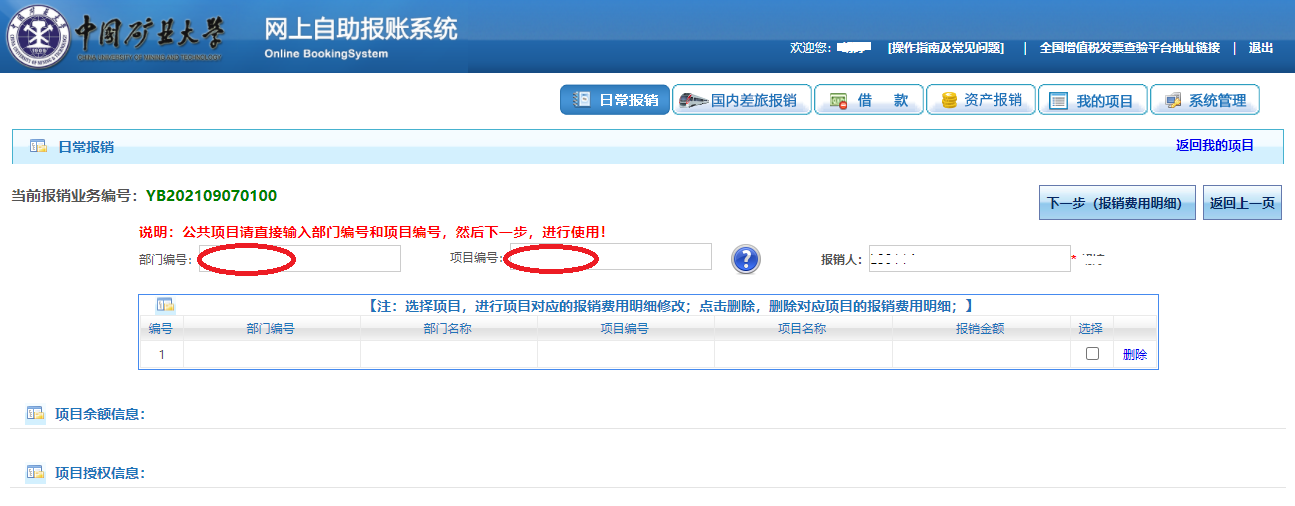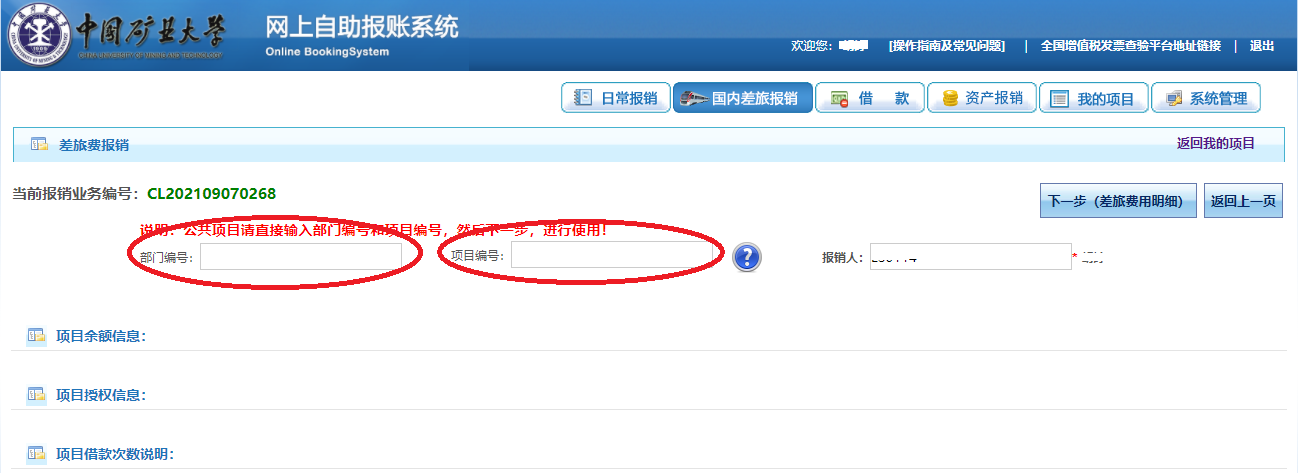 1)点击网上自助报账系统的“国内差旅报销”,“新业务填报”,输入“部门编号”、“项目编号”,并点击“下一步(差旅费用明细)”;