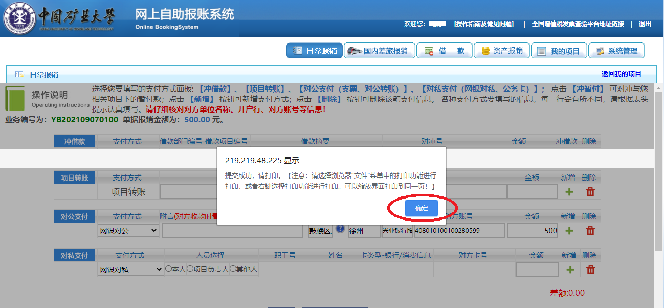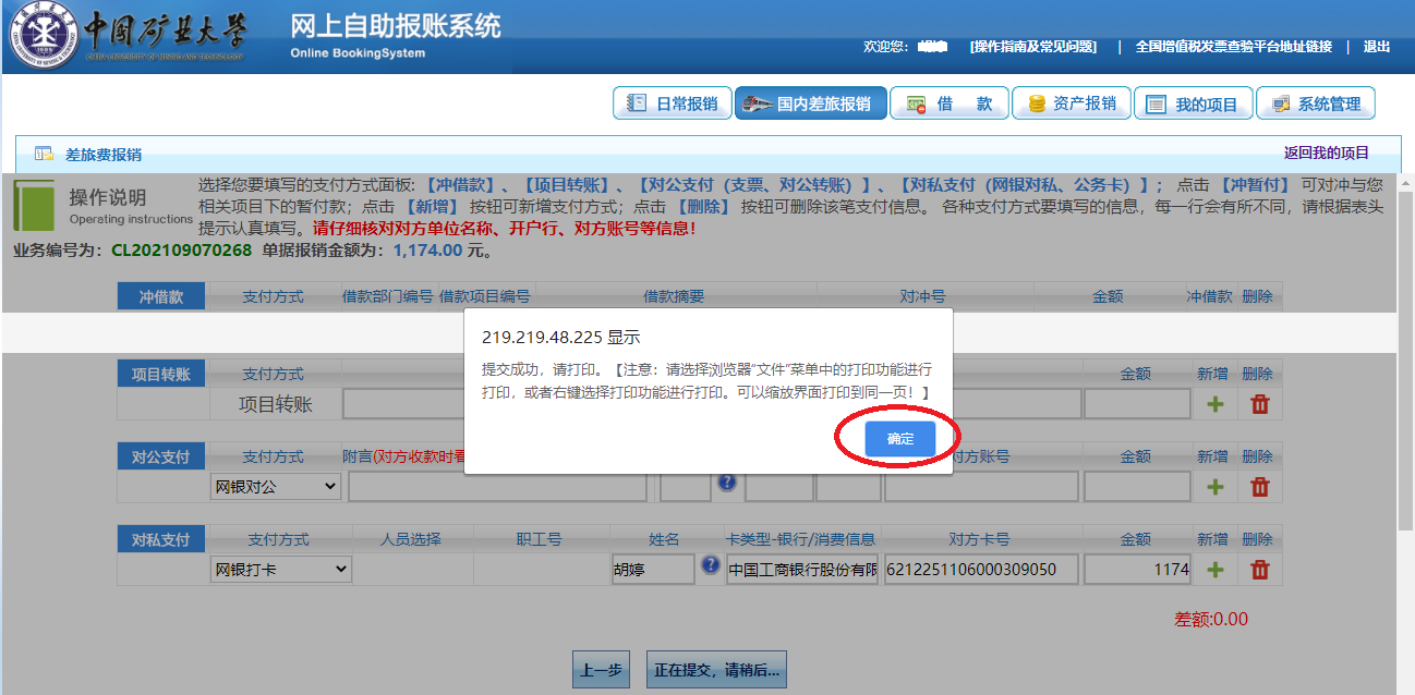 5)填写支付方式信息,点击“下一步(提交)”,点击“确定”提交并打印报销单;