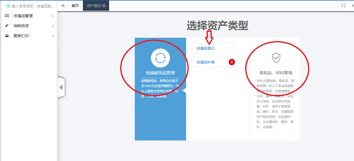 2)系统包含“低值耐用品管理”和“易耗品、材料管理”两个模块,这里以低值耐用品的登记为例,点击“低值品登记”;