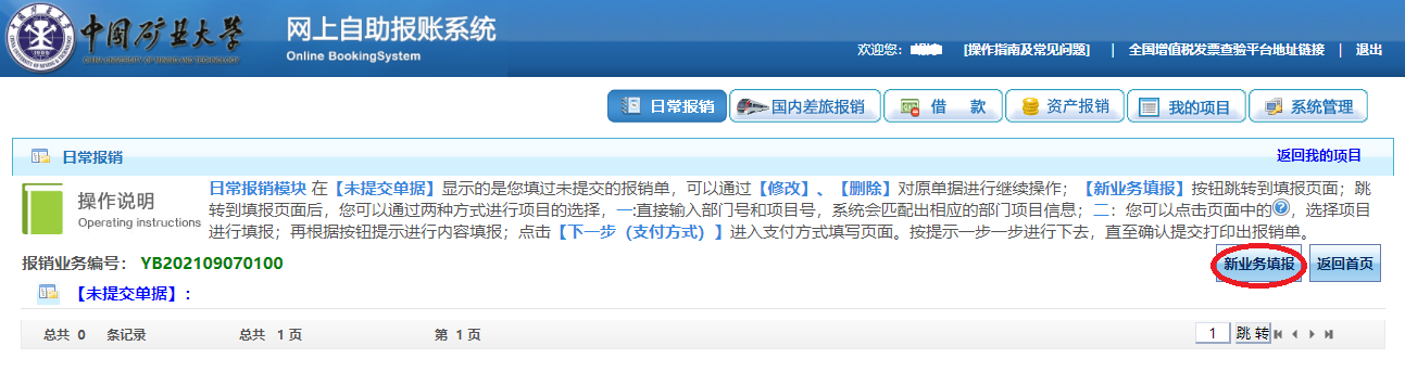 1)从学校主页融合门户或者财务处网站(http://cwzcb.cumt.edu.cn/dlpt/Login.aspx)登录网上预约报账系统,点击“日常报销”,“新业务填报”;