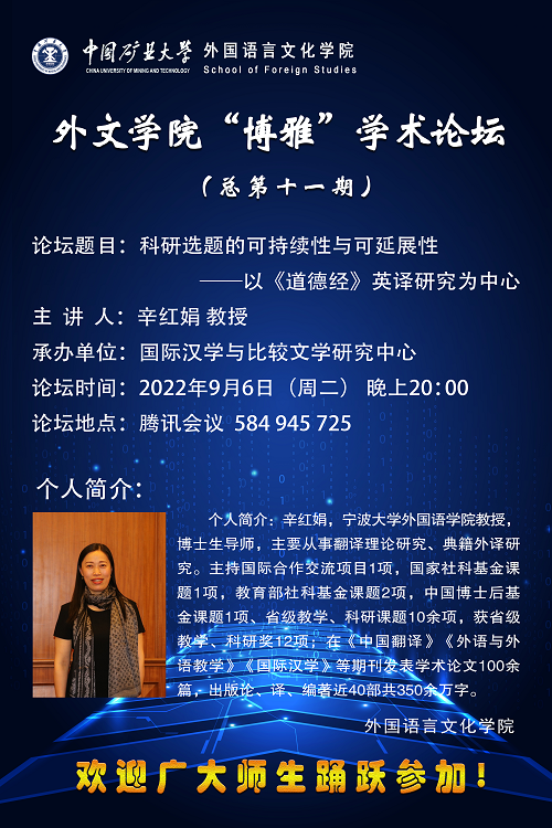 外文学院“博雅”学术论坛(总第十一期)科研选题的可持续性与可延展性——以《道德经》英译研究为中心
