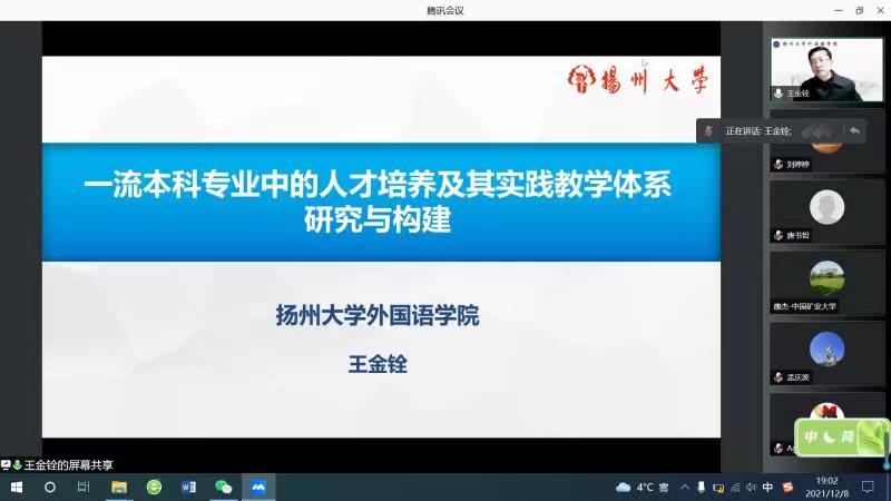 12月8日晚19时,扬州大学外国语学院院长王金铨教授在腾讯会议以为pp电子教师进行题为“一流本科专业中的人才培养及其实践教学体系研究与构建”的专题讲座。本次讲座由外文学院科研副院长祖大庆主持,外文学院教学副院长刘婷婷、英语系基层教学组织负责人和pp电子部分老师参加了此次讲座。