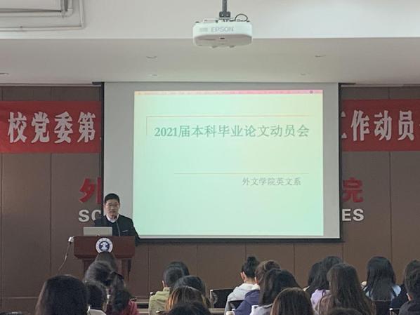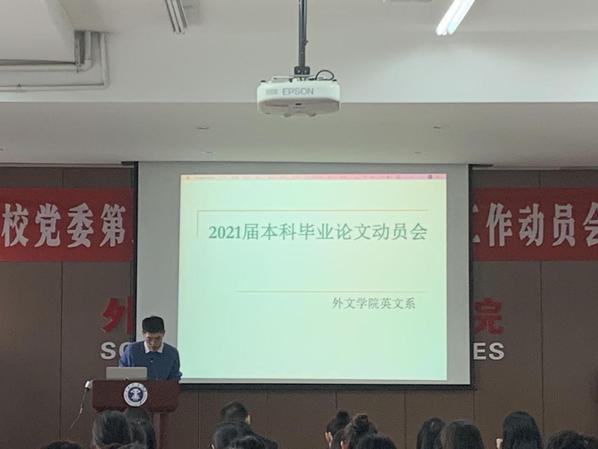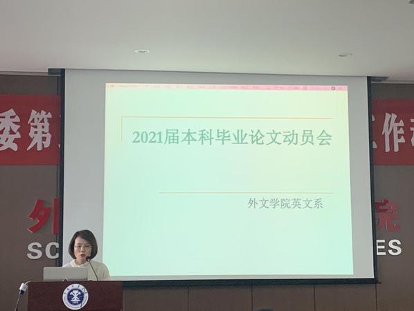 10月30日下午,英文系在B508举行“2021届本科论文动员会”。动员会邀请外文学院副院长刘婷婷老师参加,由翟柯宇老师主持,唐书哲老师和外文学院2021届英文系学生到场参加。