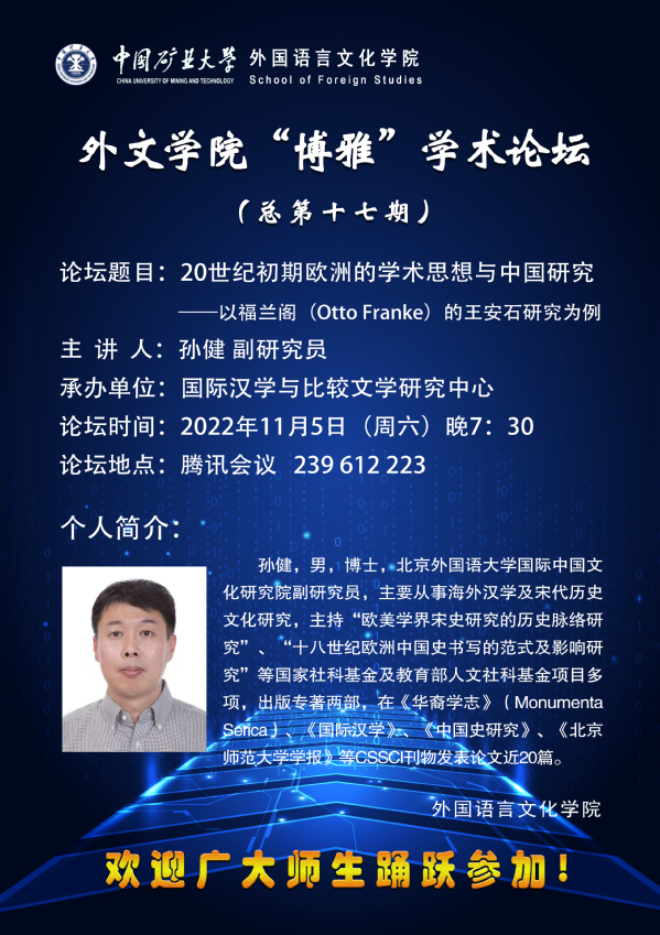 外文学院“博雅”学术论坛(总第十七期)20世纪初期欧洲的学术思想与中国研究——以福兰阁(Otto Franke)的王安石研究为例