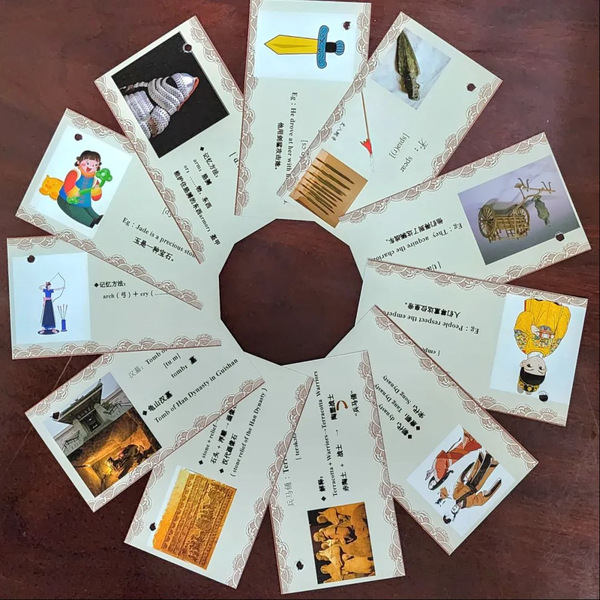 活动伊始,志愿者们为每个孩子提供了单词手卡,帮助孩子们在游览中记忆,在记忆中感受。在汉兵马俑博物馆中,讲解员带大家领略汉朝的军事风采,兵士俑们姿态各异、栩栩如生,正威严列阵、似蓄势待发。在活动体验区,小学生们体验了投壶、射箭的装备,让孩子们体验了一把“君子之艺”。临湖廊榭蔓回曲折,一面临景另一面置汉画石,石画线条刀刻斧凿,深深浅浅,明暗交织,诉说只有时光能听懂的故事。在汉文化大讲堂,汉学老师向大家普及了汉代礼仪知识,孩子们向老师行天揖礼,老师回土揖礼,一来一往,牵连起情谊,交织成传承的信念。随后,志愿者代表通过“词根/词缀+联想”记忆法,向孩子们讲解了汉文化相关英语词汇,引导孩子们将单词放入一定的语言环境,结合句意,高效记忆英语词汇。在参观过程中,志愿者们也同时采集景区不规范的标识翻译,以期规范徐州汉文化景区的标识翻译。