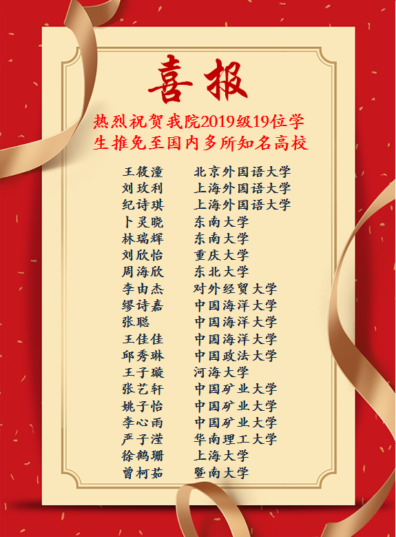 喜报:热烈祝贺pp电子2019级19位学生推免至国内多所知名高校